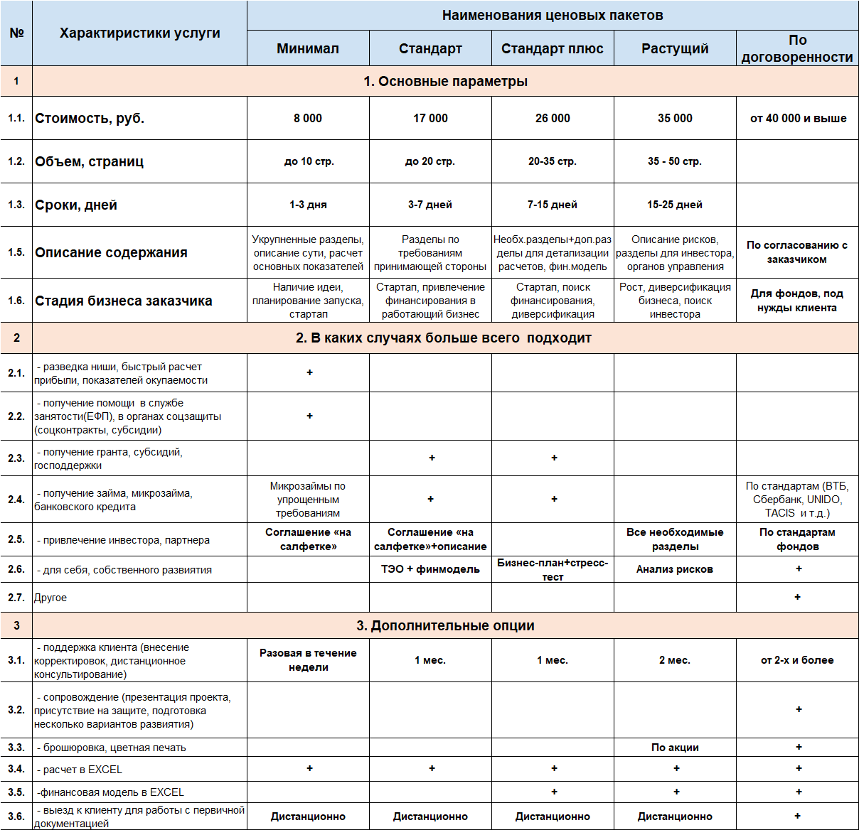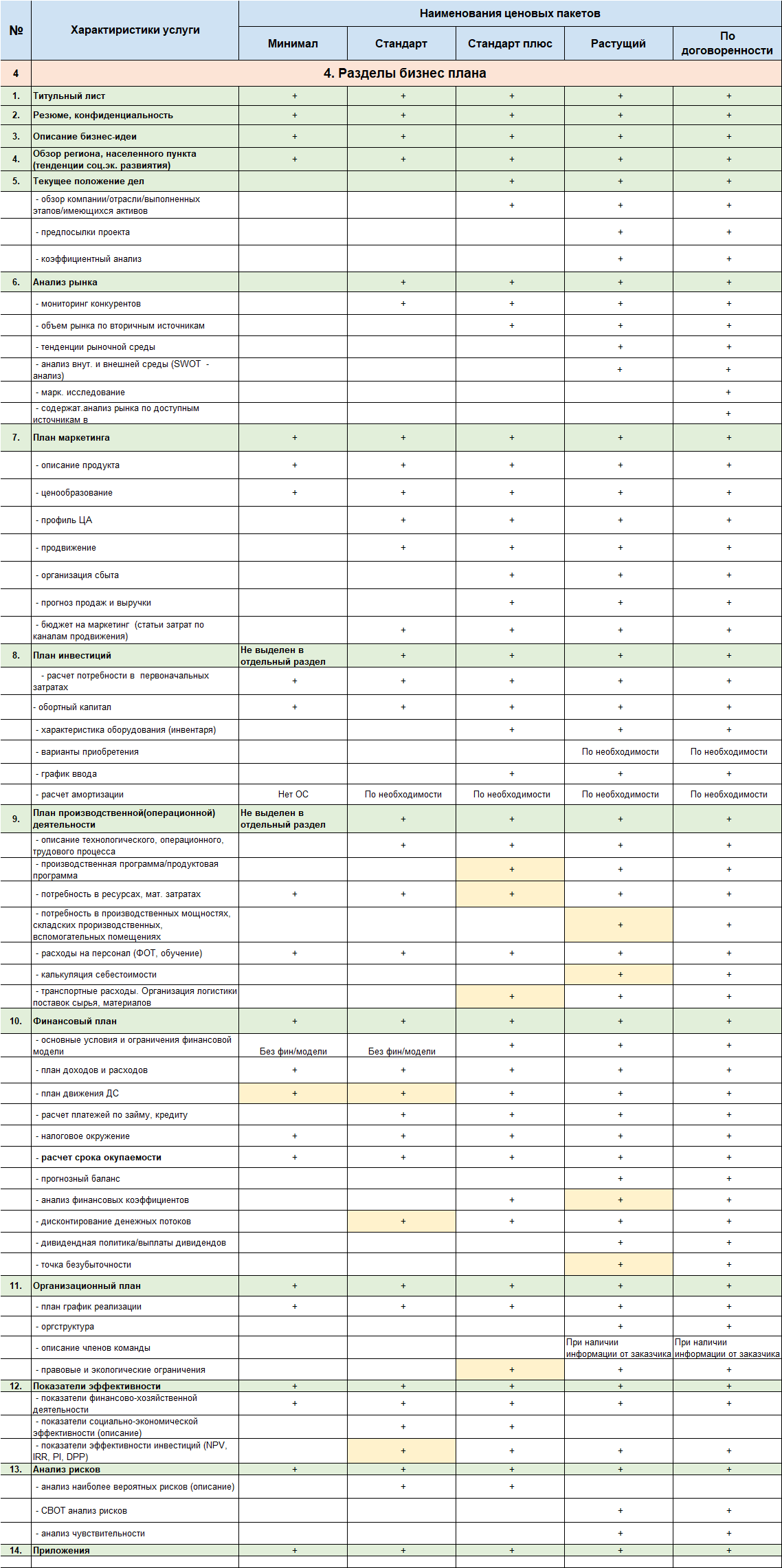 Разделы бизнес-плана, предусмотренные пакетом